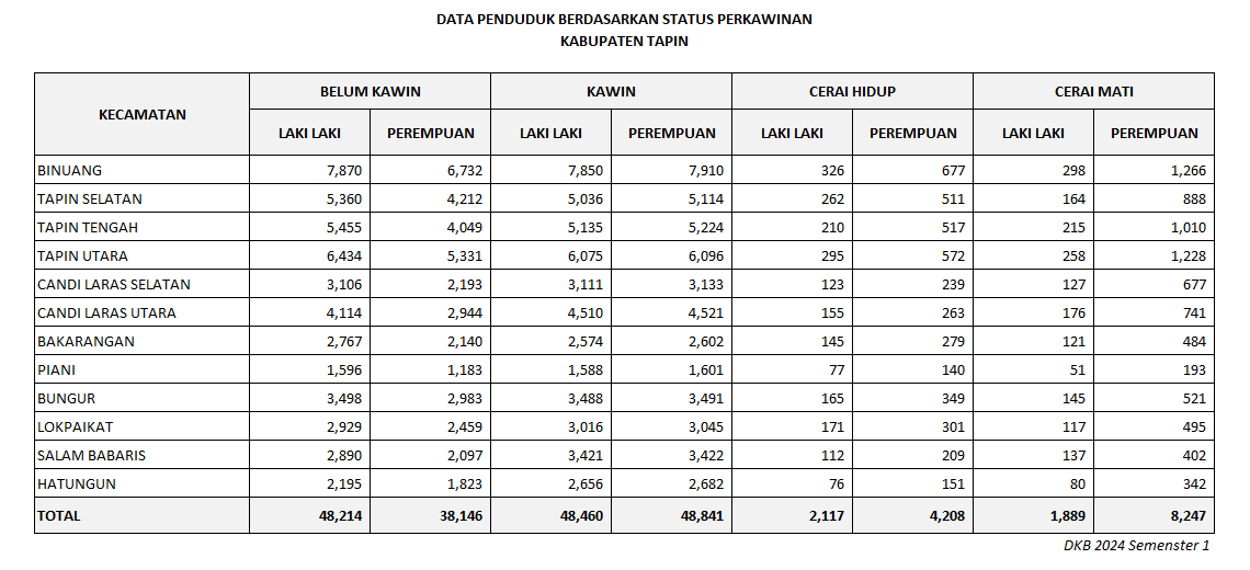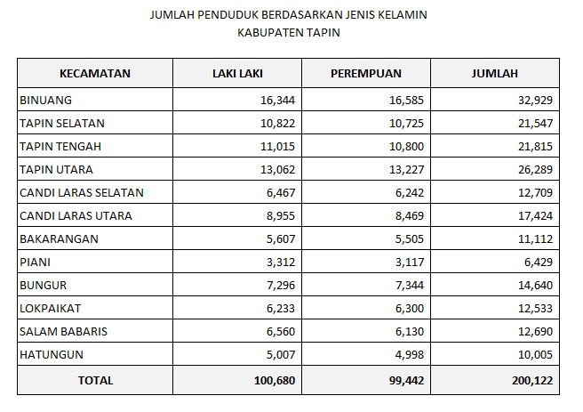 | 9 | JUMLAH PENDUDUK BERDASARKAN JENIS KELAMIN KABUPATEN TAPIN | Setiap Saat | text | Lihat File |