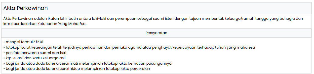 | 11 | PERSYARATAN PEMBUATAN AKTA NIKAH | Setiap Saat | text | Lihat File |
