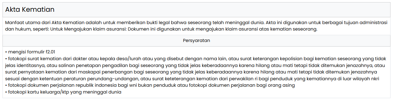 | 12 | PERSYARATAN PEMBUATAN AKTA KEMATIAN | Setiap Saat | text | Lihat File |