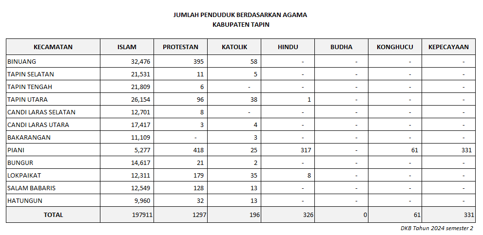 | 8 | JUMLAH PENDUDUK BERDASARKAN AGAMA KABUPATEN TAPIN | Setiap Saat | text | Lihat File |